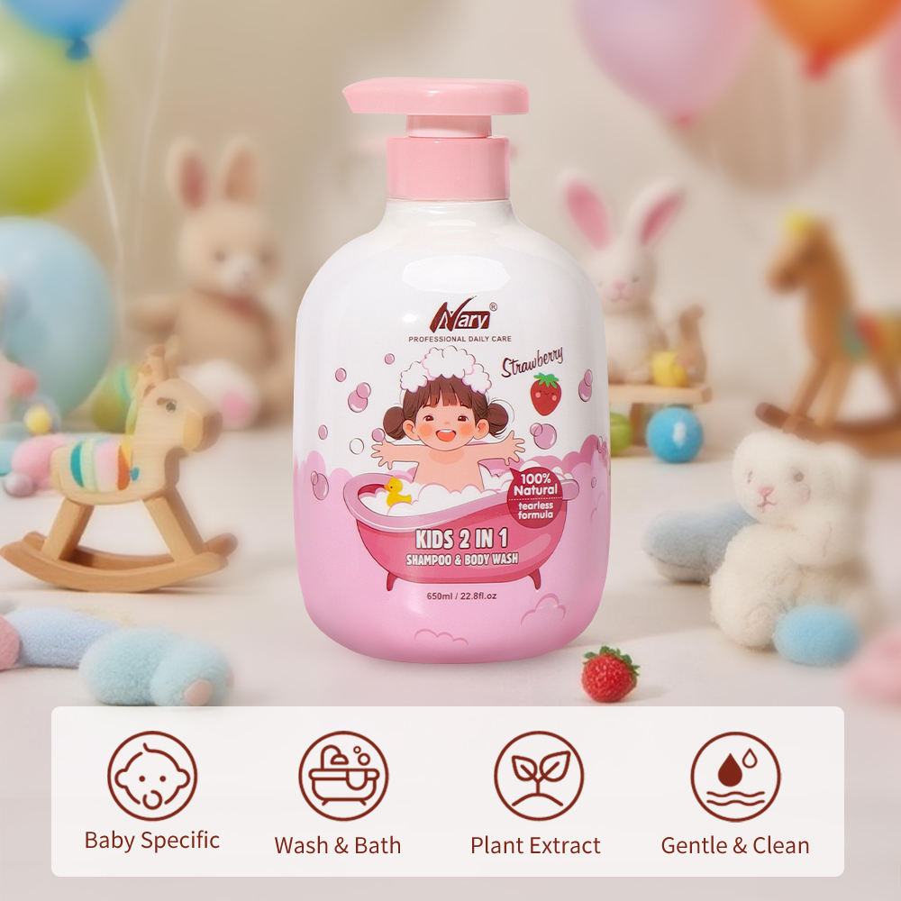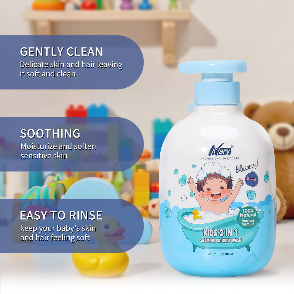 Offrez à votre enfant un moment de detente avec le Shampoing et Gel Douche 2-en-1 Nary, une solution de nettoyage complete et biologique. Specialement concu pour la peau delicate et les cheveux fins des bebes, ce gel combine des extraits de fines herbes, de myrtille et de peche. Sa formule organique nettoie en douceur tout en preservant l hydratation naturelle de l epiderme, laissant une peau souple et des cheveux soyeux. Fort de 23 ans d expertise en tant que fabricant professionnel, Nary propose ici un produit haut de gamme adapte à un usage quotidien. Ce soin nourrissant et rafraichissant convient à tous les types de peau, meme les plus sensibles. Son format genereux de 650 ml est ideal pour la routine du bain, offrant une mousse legere qui se rince facilement sans piquer les yeux.