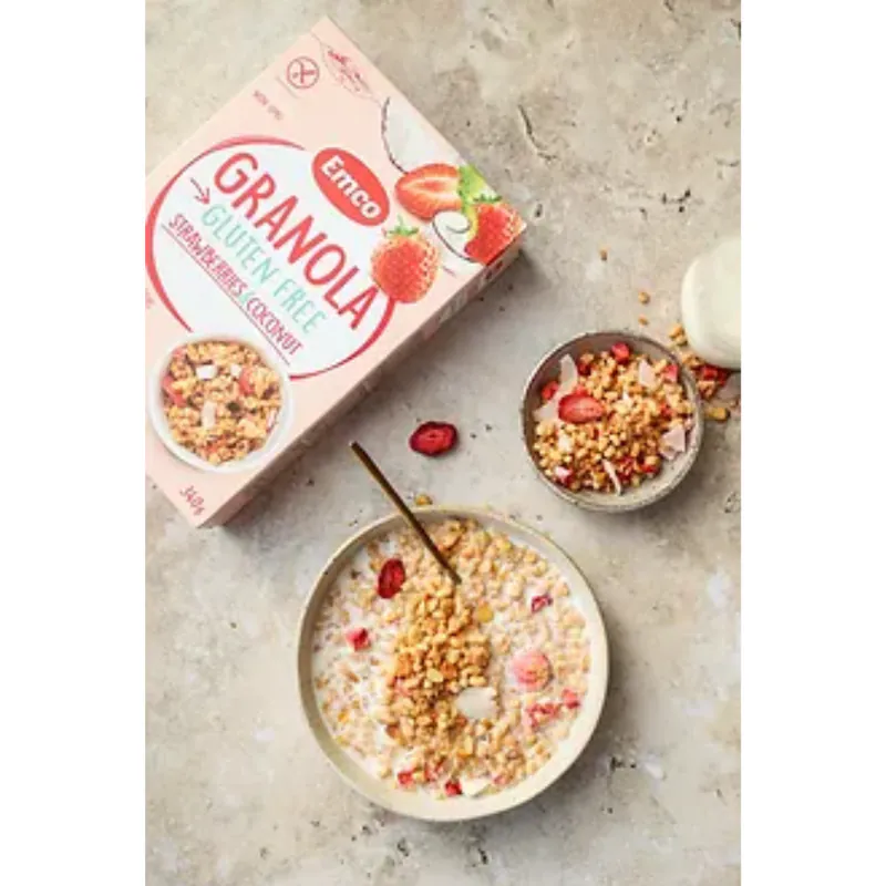 Demarrez votre journee avec une energie naturelle grace au Granola Emco, le choix ideal pour un petit dejeuner sain et gourmand. Ce melange de cereales cuites au four se distingue par sa composition non raffinee, associant le croquant des noix à la douceur des fraises et de la noix de coco. Elabore à partir de flocons d avoine sans gluten, il repond parfaitement aux besoins des personnes attentives à leur digestion et à leur bien-etre. Ce granola est un veritable concentre de bienfaits : il est riche en proteines, à base de plantes et affiche une teneur en matieres grasses inferieure à 20%. Sa formulation sans sucres ajoutes en fait un allie precieux pour maintenir un regime equilibre sans renoncer au plaisir. Que ce soit dans un bol de lait vegetal ou en garniture sur un yaourt, ce produit pret à manger vous offre une solution rapide et nutritive chaque matin.
