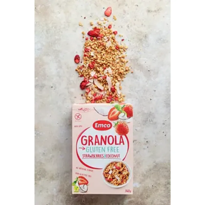 Demarrez votre journee avec une energie naturelle grace au Granola Emco, le choix ideal pour un petit dejeuner sain et gourmand. Ce melange de cereales cuites au four se distingue par sa composition non raffinee, associant le croquant des noix à la douceur des fraises et de la noix de coco. Elabore à partir de flocons d avoine sans gluten, il repond parfaitement aux besoins des personnes attentives à leur digestion et à leur bien-etre. Ce granola est un veritable concentre de bienfaits : il est riche en proteines, à base de plantes et affiche une teneur en matieres grasses inferieure à 20%. Sa formulation sans sucres ajoutes en fait un allie precieux pour maintenir un regime equilibre sans renoncer au plaisir. Que ce soit dans un bol de lait vegetal ou en garniture sur un yaourt, ce produit pret à manger vous offre une solution rapide et nutritive chaque matin.